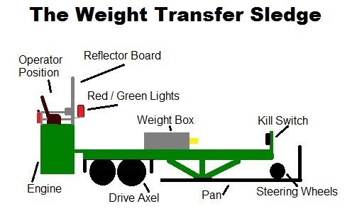 The Sledge weighs around four tons and has the stopping force of over thirteen tons to allow the supercharged A class Mini Modifieds to hook on the front. The sledge also is fitted with a diesel land rover engine to allow the operator to drive the sledge to and from the track as well as back to the start line after each pull.